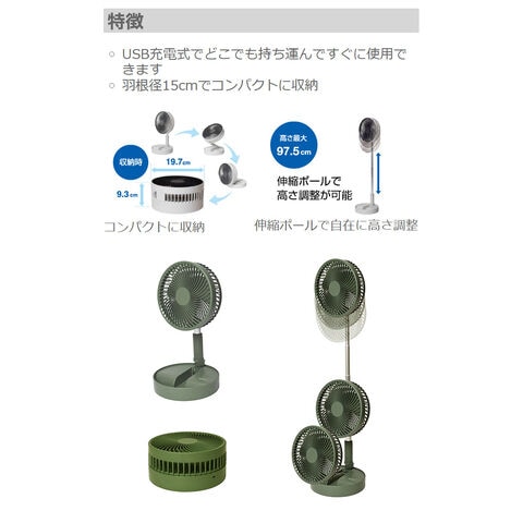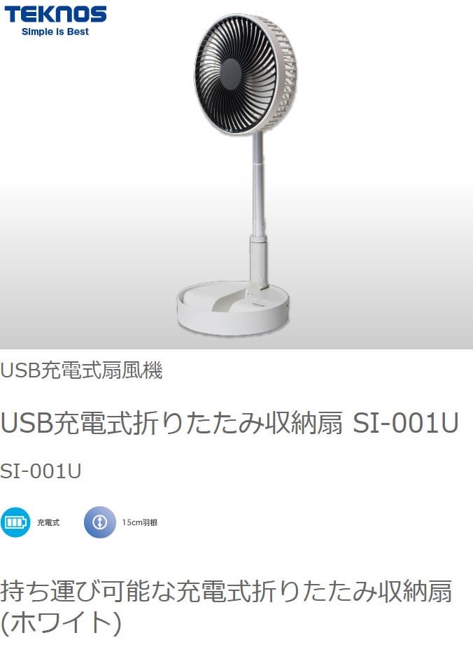 TEKNOS USB充電式折りたたみ収納扇風機 サーキュレーター 卓上扇風機 ポール伸縮可 折り畳み シンプル コンパクト 卓上 ホワイト モスグリーン SI-001U SI-004UG テクノス【送料無料】