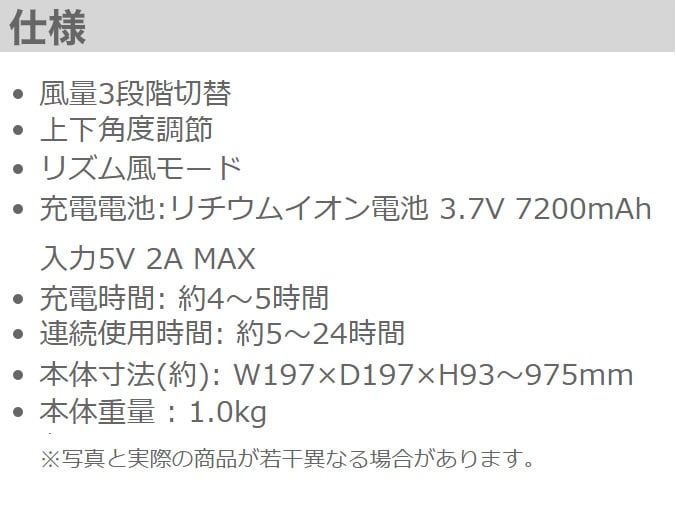 充電電池:リチウムイオン電池 3.7V 7200mAh 入力 5V 2A MAX
