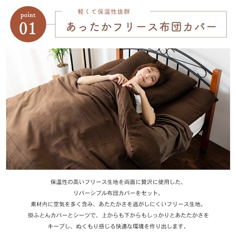 掛布団カバー、ワンタッチシーツ、枕カバーの生地には軽量で保温力が高い素材のフリース生地を採用しました!(フリース素材の特性の説明補足)