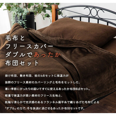 布団8点セット 毛布とフリース素材のカバー付き フランネル毛布 ピーチスキン加工 布団セット 掛け布団 敷布団 枕 あったか 保温性 弾力性 フランネル 寝具セット むれにくい【送料無料】