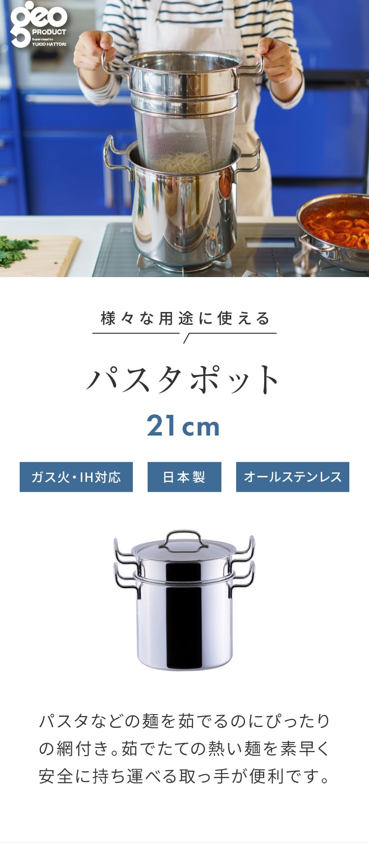 ジオ・プロダクト 日本製 パスタポット 21cm GEO-21P パスタ鍋 ガス火・IH対応 オーブン可 GEO ジオ 服部幸應先生 国産 宮崎製作所 Miyaco ジオプロダクト【送料無料】