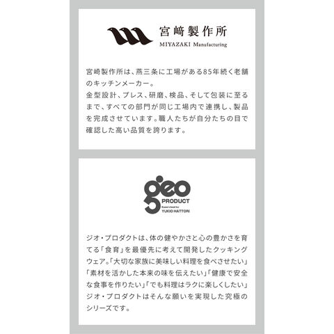 ジオ・プロダクトは、開発に食育の第一人者服部幸應先生を招き、体の健やかさと心の豊かさを育てる「食育」を最優先に考えて開発したクッキングウェアです。