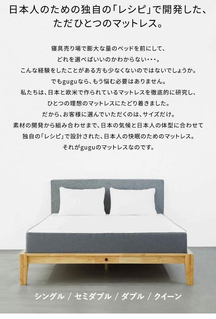 guguマットレスは日本人の体型に合わせて設計。ほど良い硬さが、確かなサポートと質の高い睡眠をお約束します。