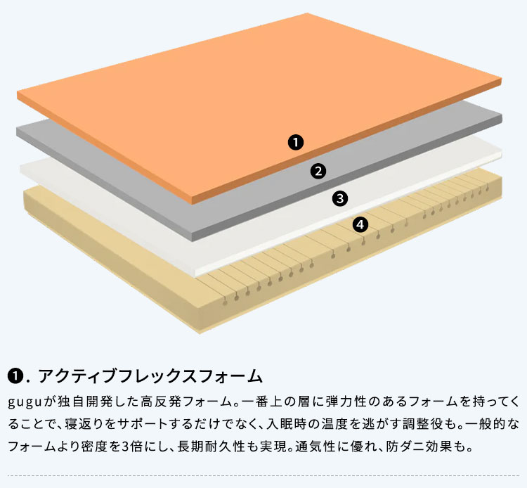 gugu独自開発の「アクティブ・フレックス・フォーム・マットレス」は、体の熱を上手に逃すことで内部温度を下げ、脳温も下がって眠りに入るという自然な入眠に最適な温度コントロールを補助。