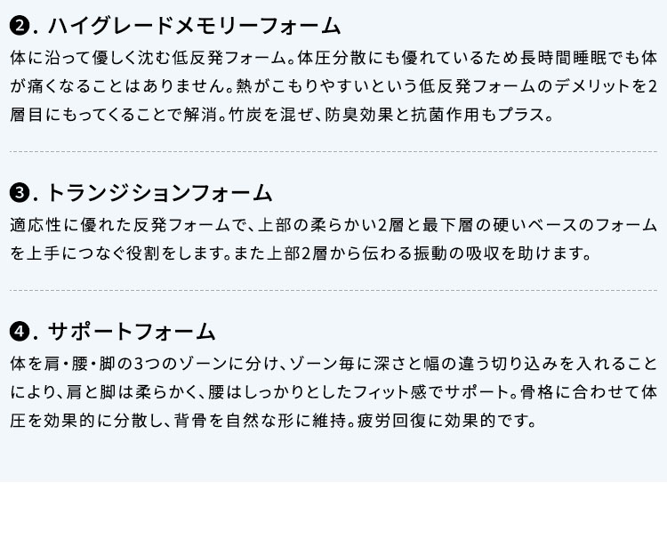 高反発と低反発、両方のよさをミックスした構造を採用。高反発は寝返りを助け、低反発はやさしい眠りをサポート。日本人好みの程よい弾力性で、夜中に何度も目が覚めるのを防ぎ、深い眠りを手に入れられます。