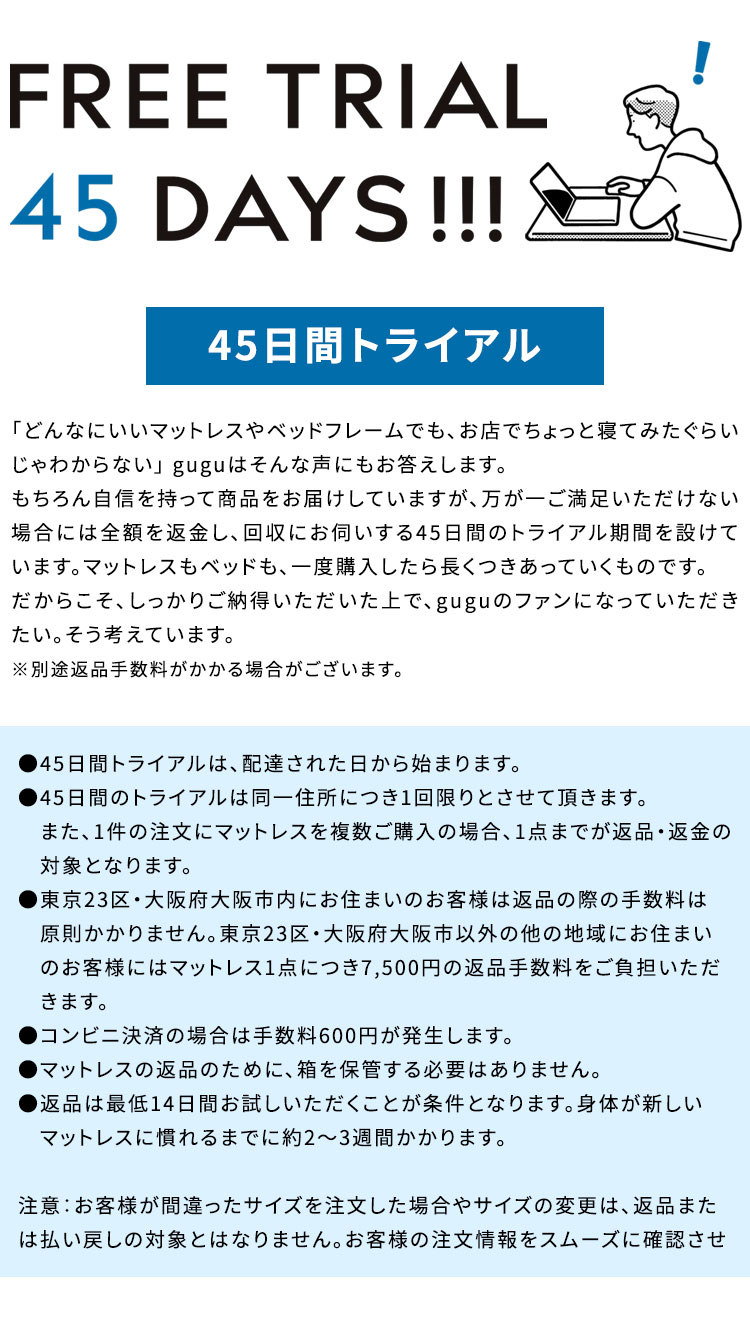 ・45日間のトライアルは同一住所につき1回限りとさせて頂きます。また、1件の注文にマットレスを複数ご購入の場合、1点までが返品・返金の対象となります。