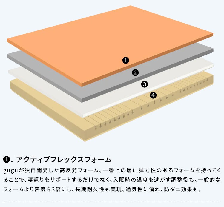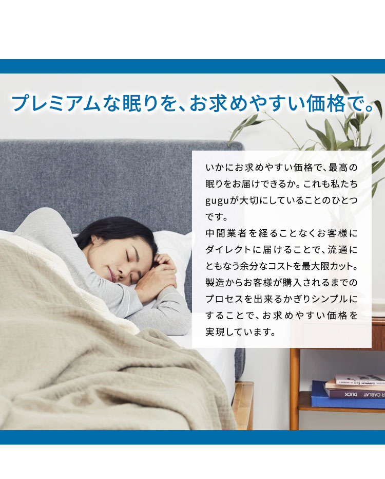 guguマットレスは日本人の体型に合わせて設計。ほど良い硬さが、確かなサポートと質の高い睡眠をお約束します。