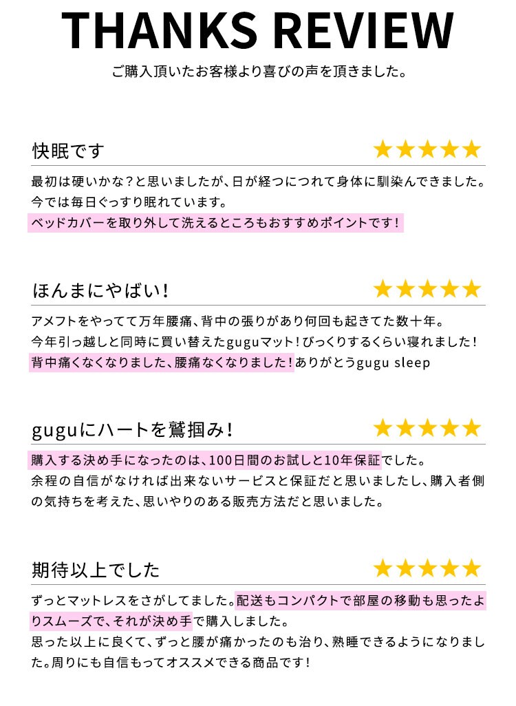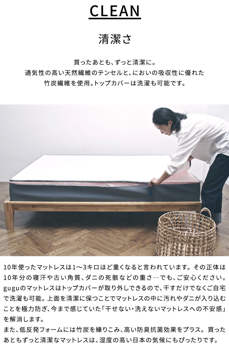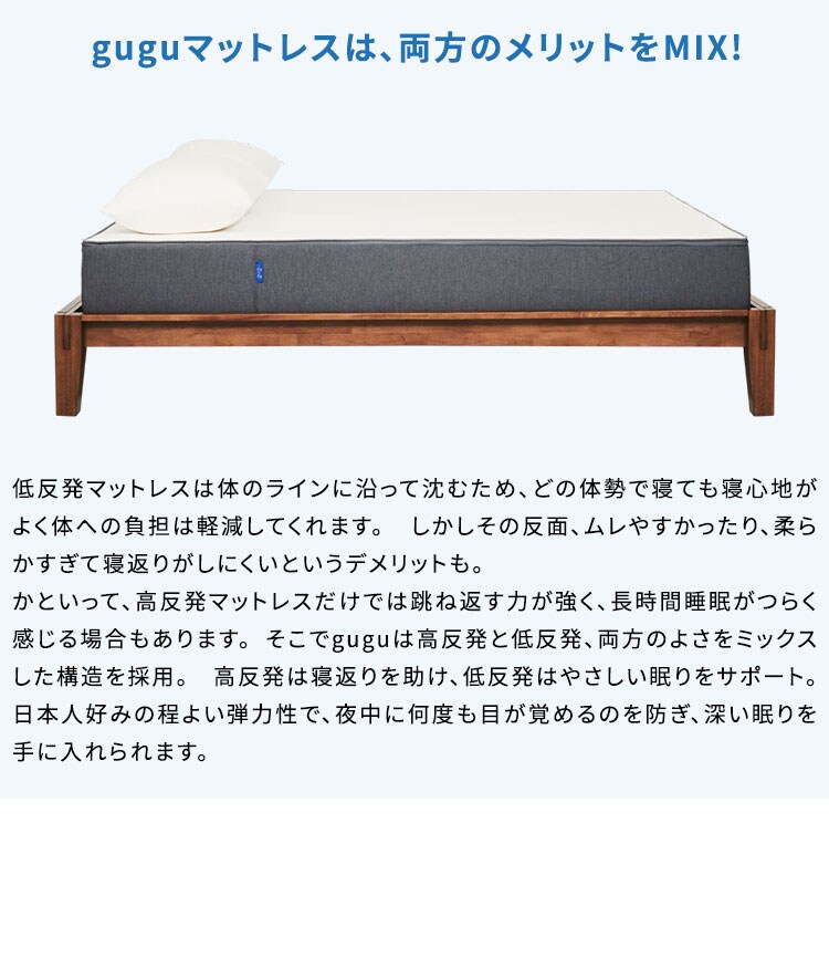 guguマットレスは日本人の体型に合わせて設計。ほど良い硬さが、確かなサポートと質の高い睡眠をお約束します。