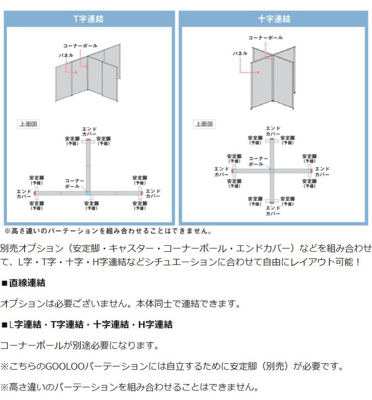 コーナーポール(別売)を使用すれば、L字・T字・十字・コの字・H字などさまざまなレイアウトが可能!