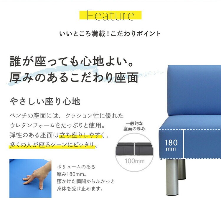 誰が座っても心地よいこだわりの座り心地。弾力があり肉厚の座面はへたりにくく立ち座りもしやすいので、多くの人が座るシーンに最適です。