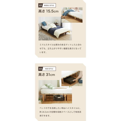・ベッドフレームは高さが3段階調整可能なので、お好みの高さに調整できます。