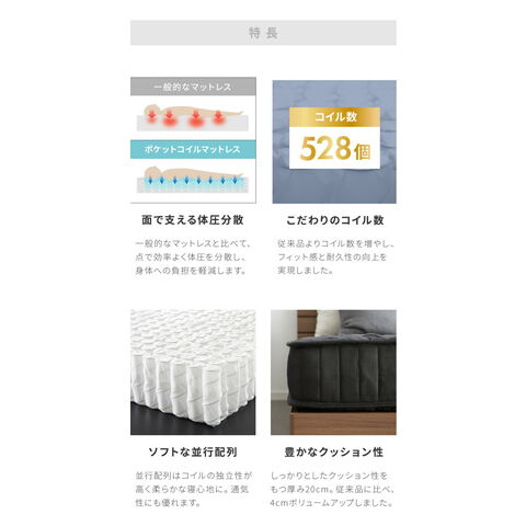 ・マットレスはコイル数528個で、フィット感と耐久性があります。