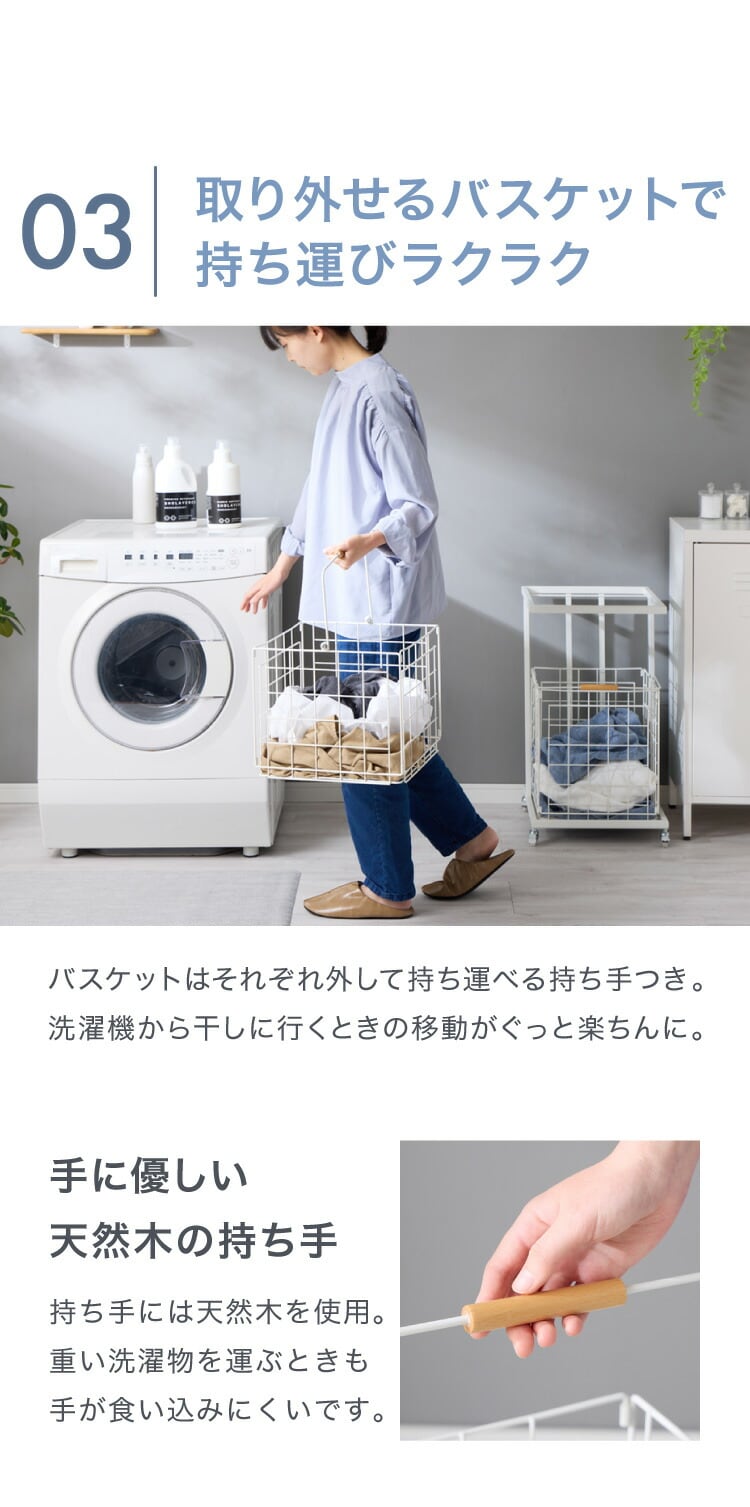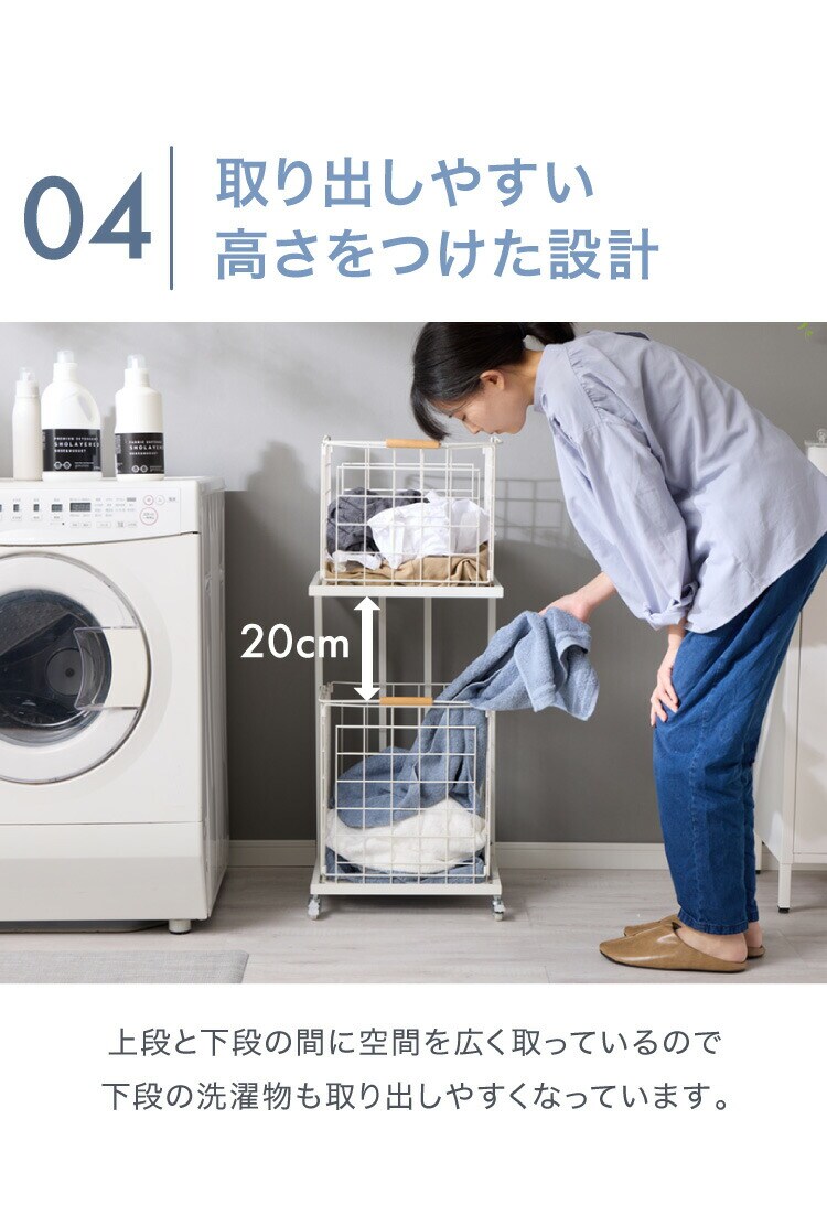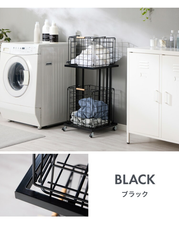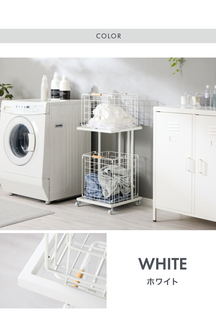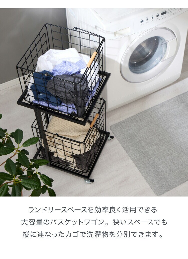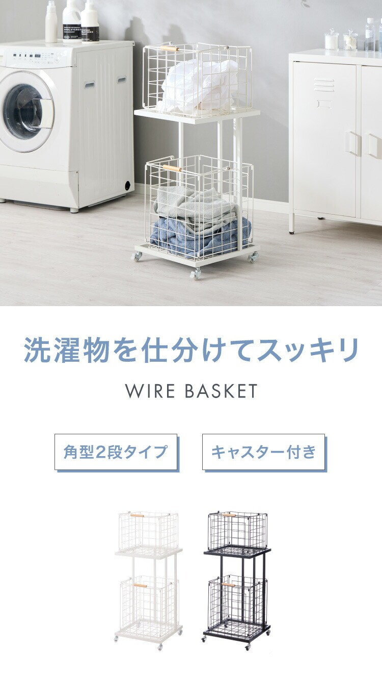 ランドリーバスケット 2段 木取っ手 角型 ランドリーワゴン 洗濯かご キャスター付き スリム スクエアタイプ ランドリーラック ランドリーボックス ワイヤーバスケット バスケット ランドリー収納【送料無料】