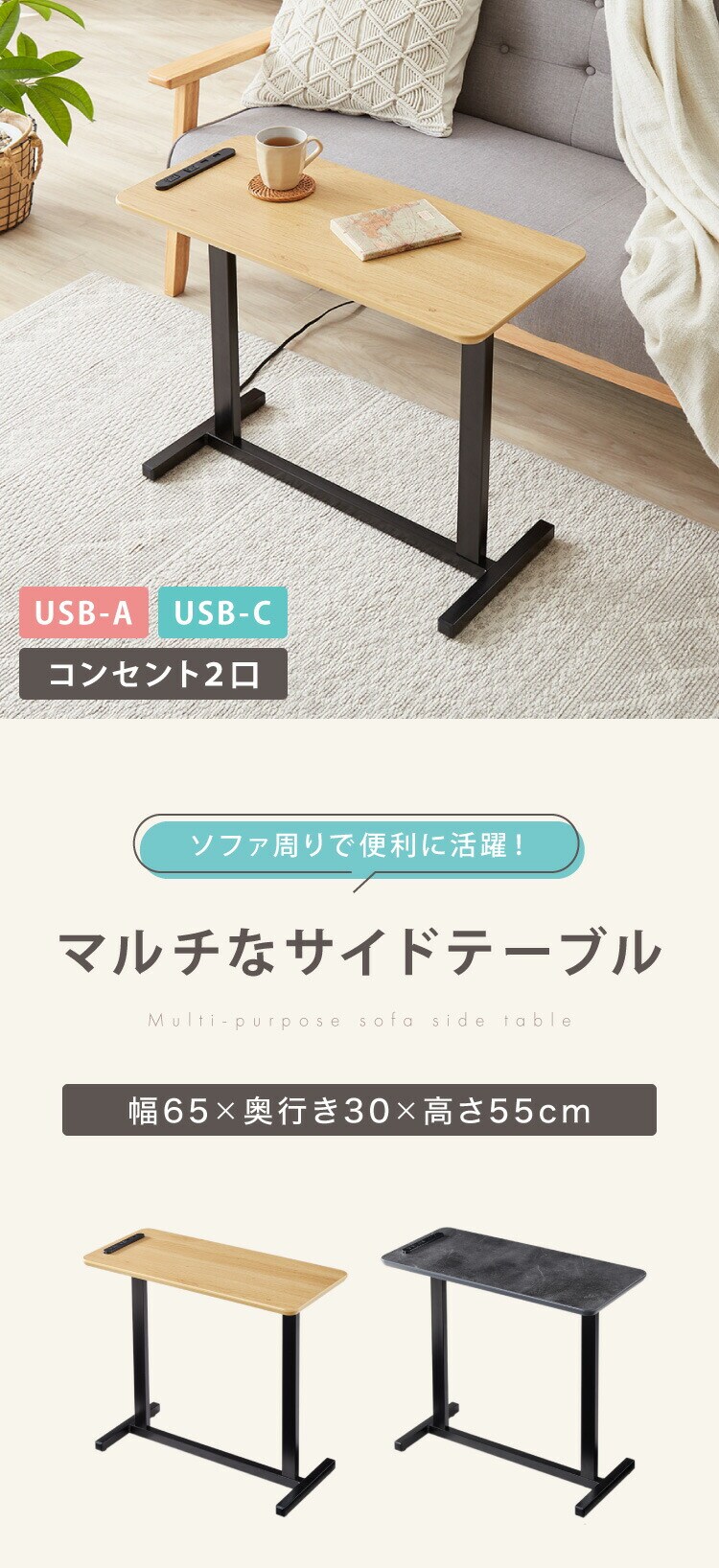マルチサイドテーブル 幅65cm コンセント付き 高さ55cm ソファテーブル サイドテーブル ミニテーブル ベッドサイド ナイトテーブル ソファ横 マルチテーブル ソファ ベッドサイド テーブル【送料無料】