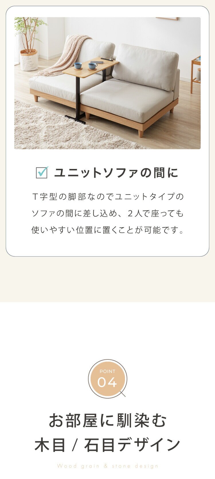 ・脚がT字になっており、モジュールソファの間に置いても使えます。