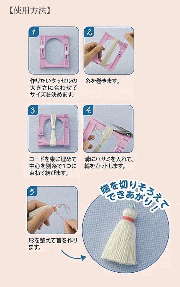 お好みの糸を使って、簡単にタッセルがをることができます。作ったタッセルは、アクセサリーやインテリアなど、様々なアレンジを楽しめます。 |