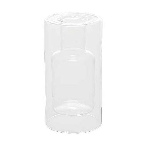 クリアの円柱の中にうっすらと個性的なフォルムが浮かんで見えるフラワーベース。