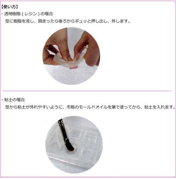粘土や透明感のあるレジンクラフトにも楽しめる、繰り返し使えるやわらかい型です。紫外線を通す透明なモールドなのでUVレジンがきれいに固まります。また、気泡や粘土の浮きがひと目でわかって便利です。