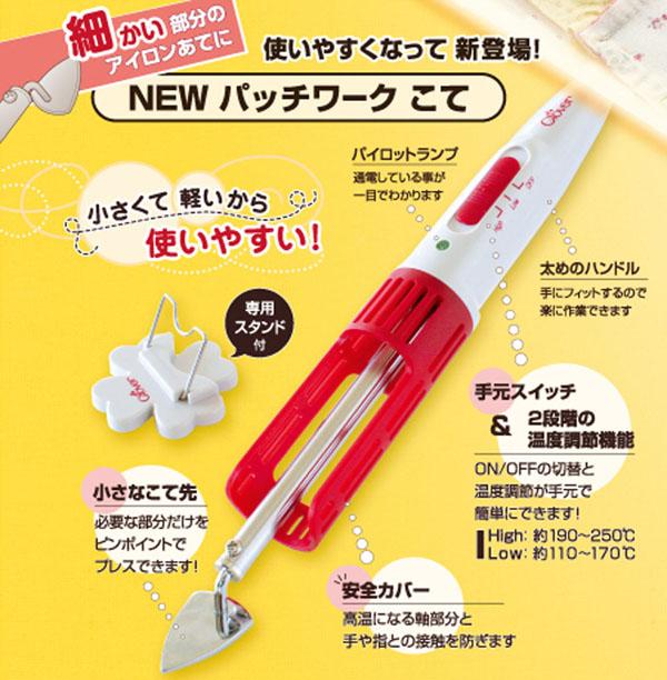 | 細かい部分のアイロンあてに便利な「こて」です。高温になる軸部分から手や指を守る安全カバーと、2段階の温度調節が可能な手元スイッチ付きです。パッチワークのぬいしろ倒し、アップリケ、バイアステープワークなどの細かい作業がはかどります。ソーイングやその他手芸にも便利です。 |