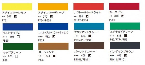 | セット内容 | 120ml×12色セット 【セット配色】 267、270、398、318、504、512、564、615、623、234、409、403 |