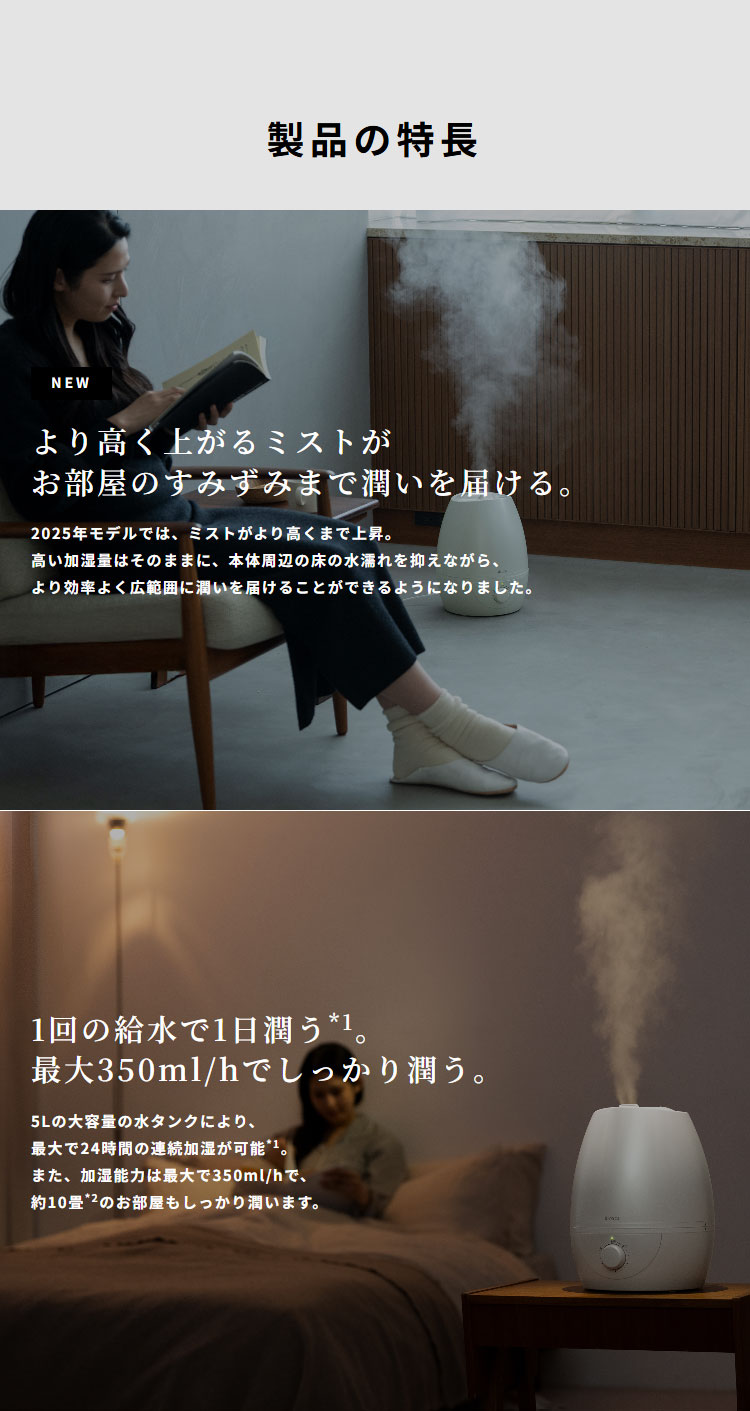 ・ミストを高くまで上げることで、すみずみまでお部屋をうるおすパワフル加湿。床など本体周辺の水濡れを抑え、効率よく加湿します。