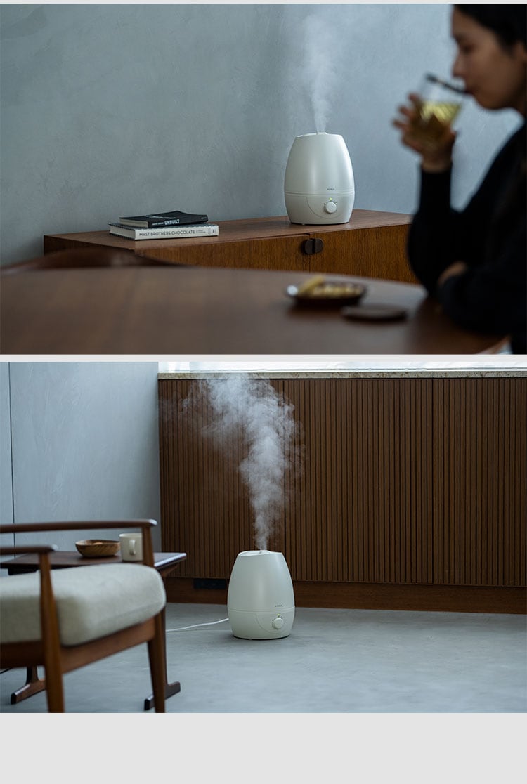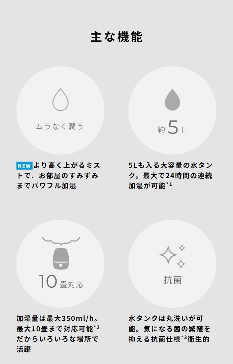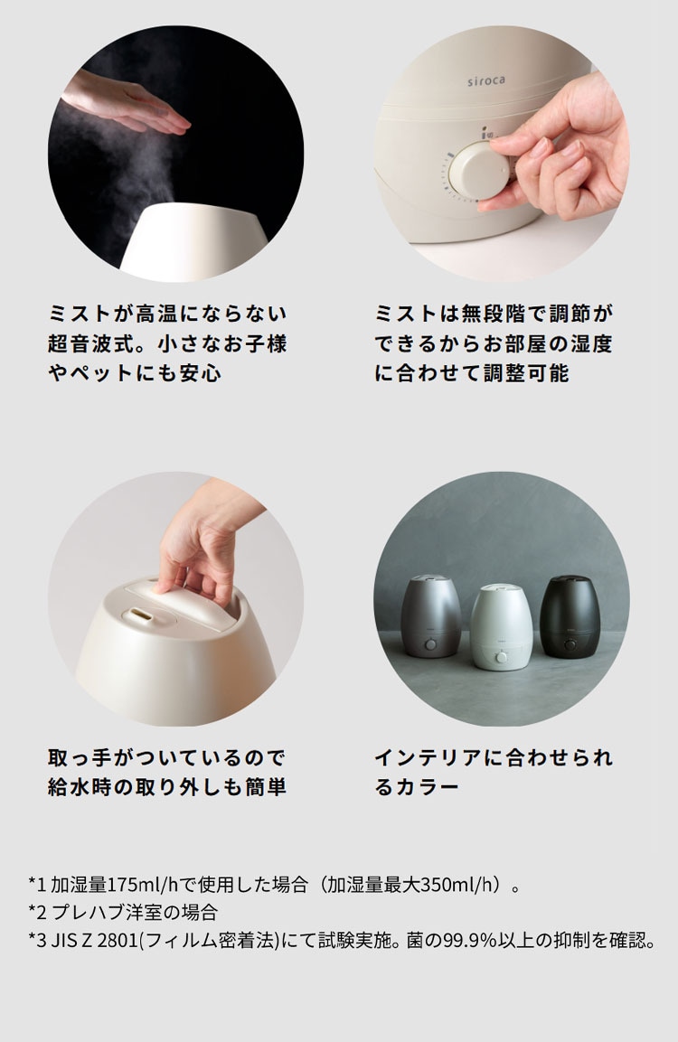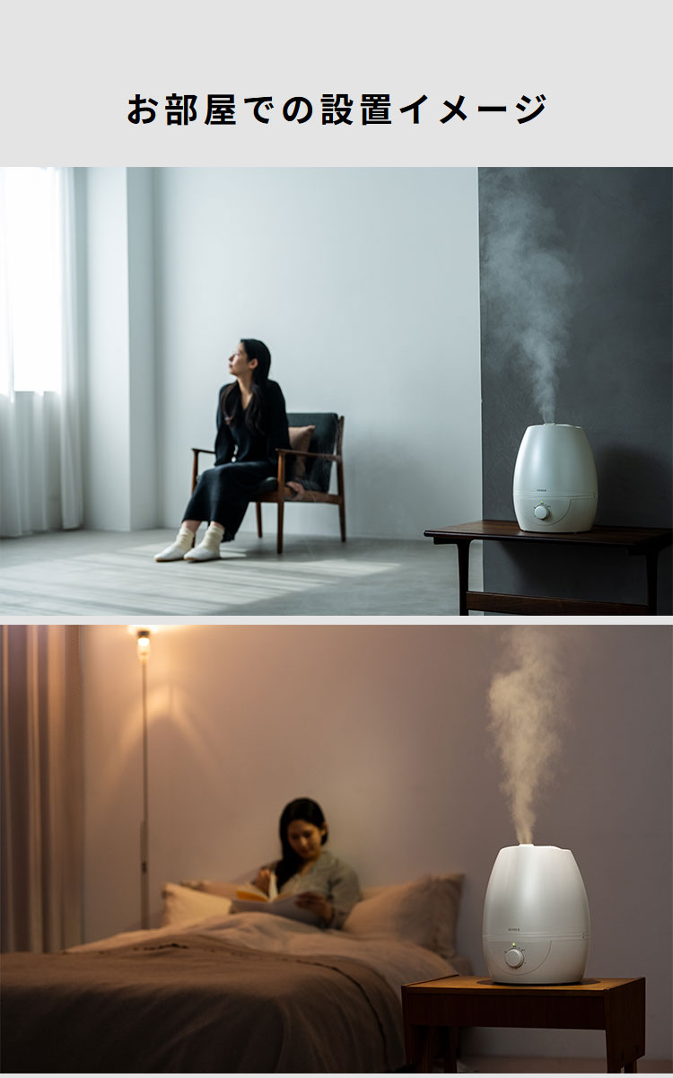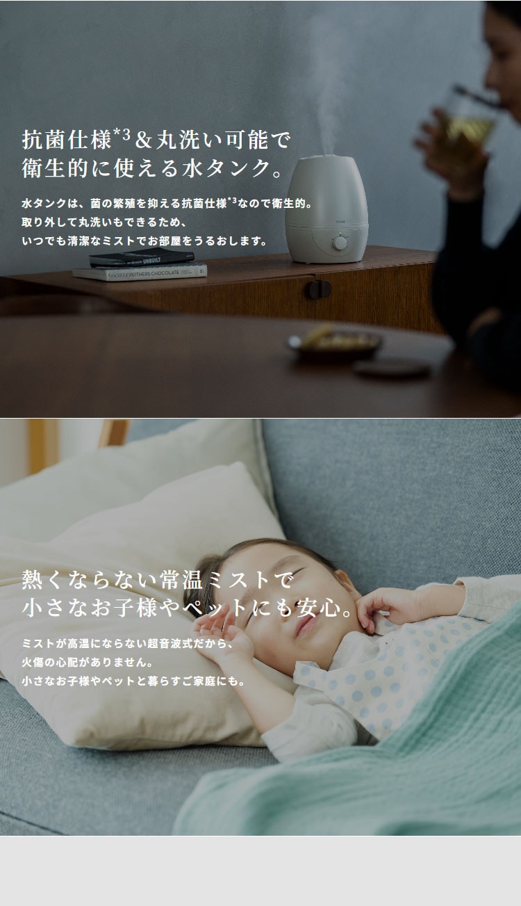 ・熱くならないミストでお部屋をうるおす超音波式。常温ミストのため小さなお子様やペットと暮らすご家庭にも。すばやい加湿、静かな運転音も超音波式ならでは。