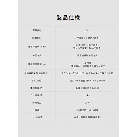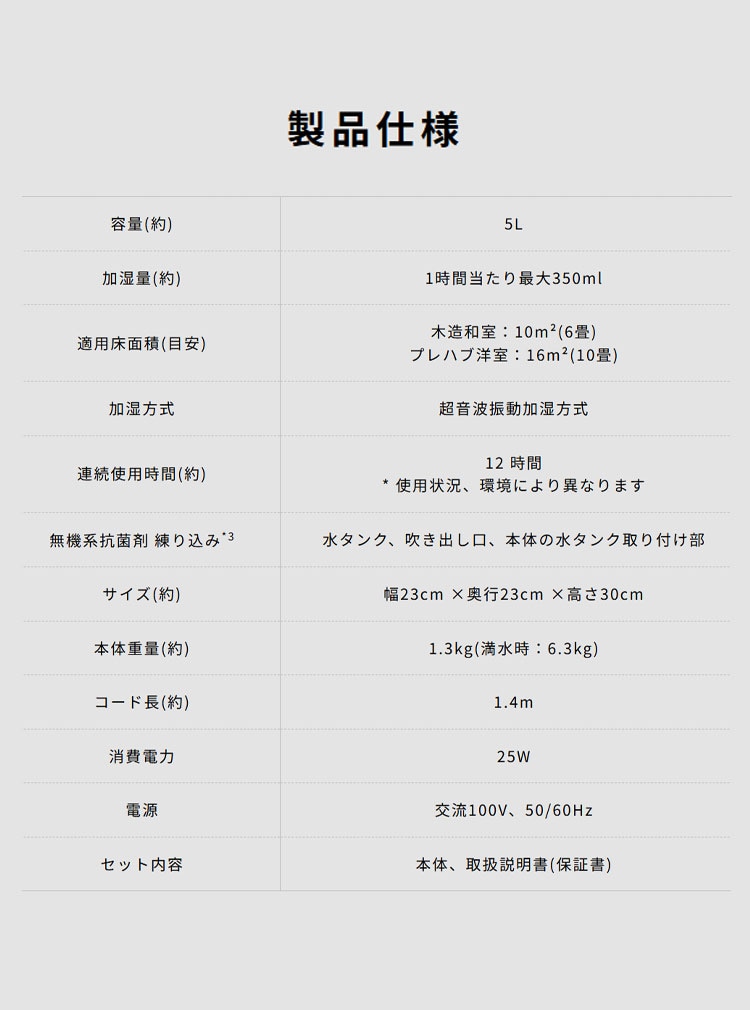 ・連続使用時間(約):12時間 ※最大加湿量350ml/hで使用した場合。使用状況、環境により異なります。