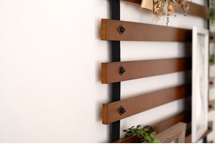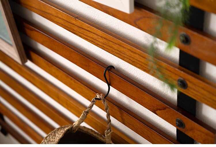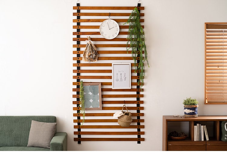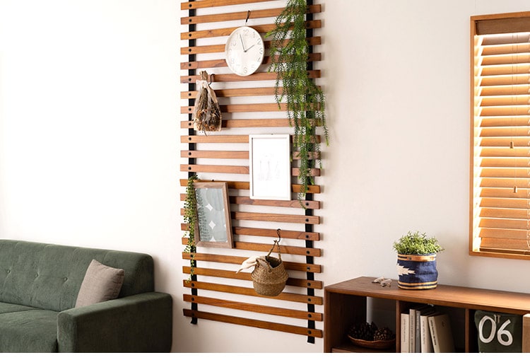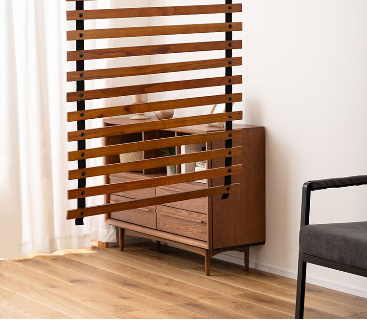 吊り下げて省スペースに設置できる、天然木の雰囲気溢れるナチュラルなパーテーション。
