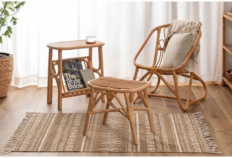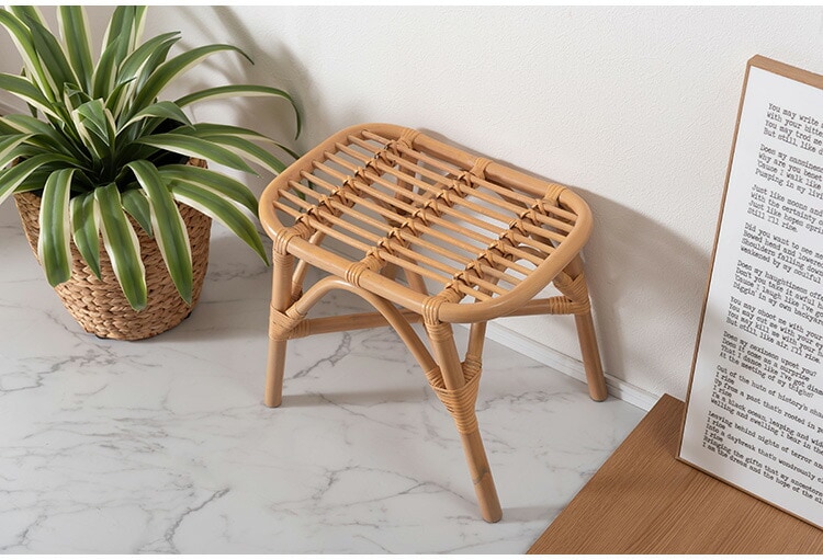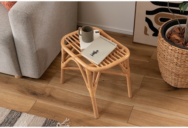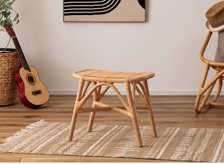 鼓(つづみ)のようなフォルムが可愛いラウンドスツール、湾曲した広めの座面でゆったり座れるラタンスツール、マガジンラック付きサイドテーブルの3アイテムがラインナップしています。