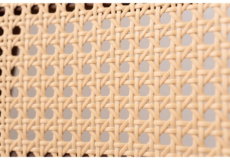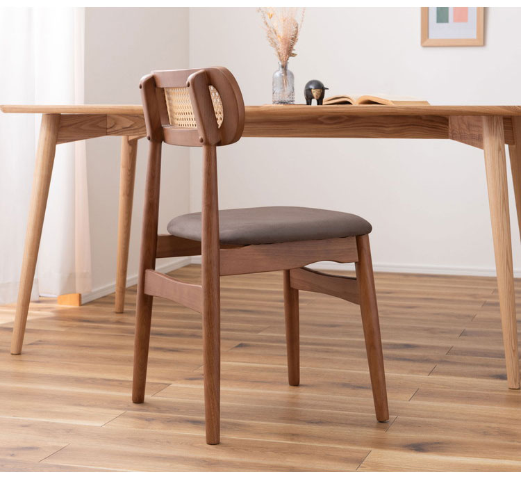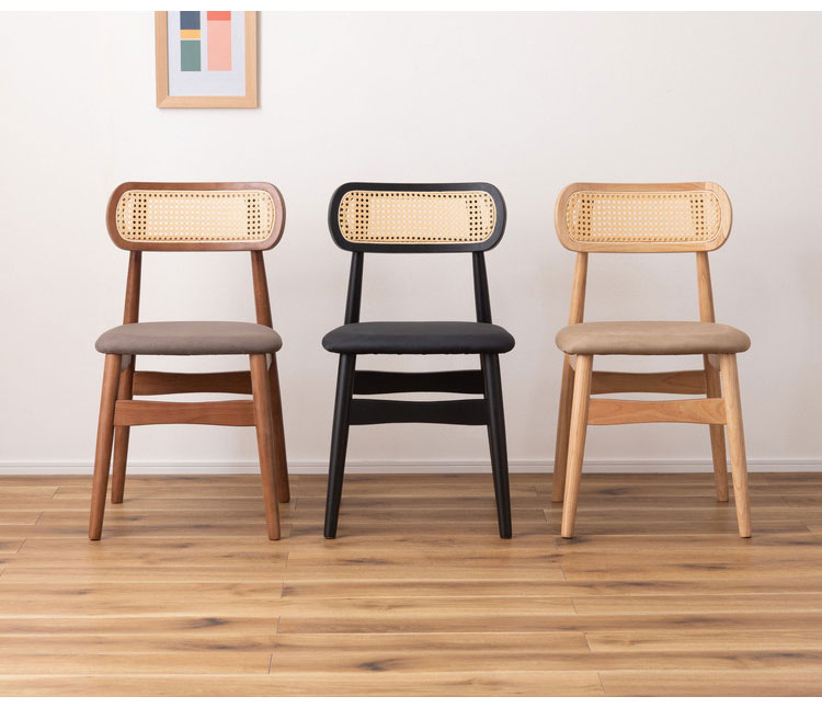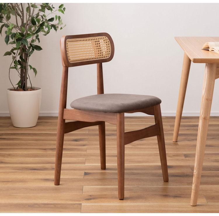 高級感のあるスエード調の座面×天然木×ポリプロピレン素材の人口ラタンが優しい雰囲気を作り出してくれるチェア。