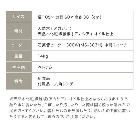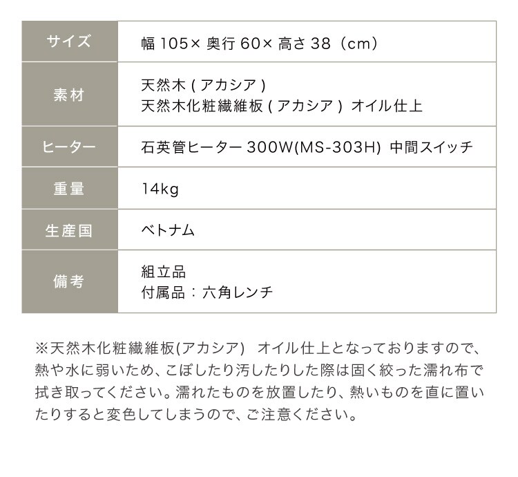 ※天然木化粧繊維板(アカシア) オイル仕上となっておりますので、熱や水に弱いため、こぼしたり汚したりした際は、固く絞った濡れ布で拭き取ってください。
