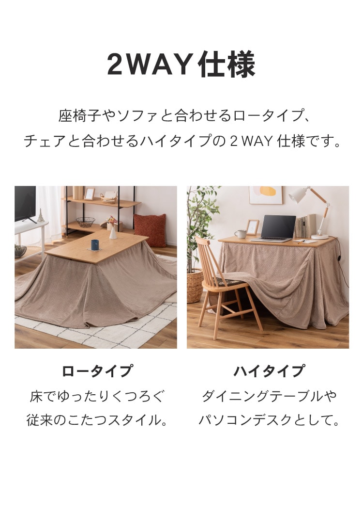 ロータイプは、床でゆったりくつろぐ従来のこたつスタイル。ハイタイプは、デスクやダイニングテーブルとして使う事が出来ます。