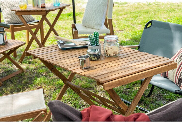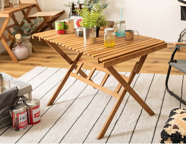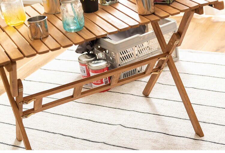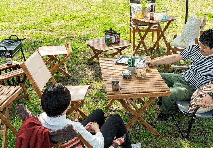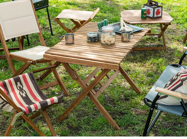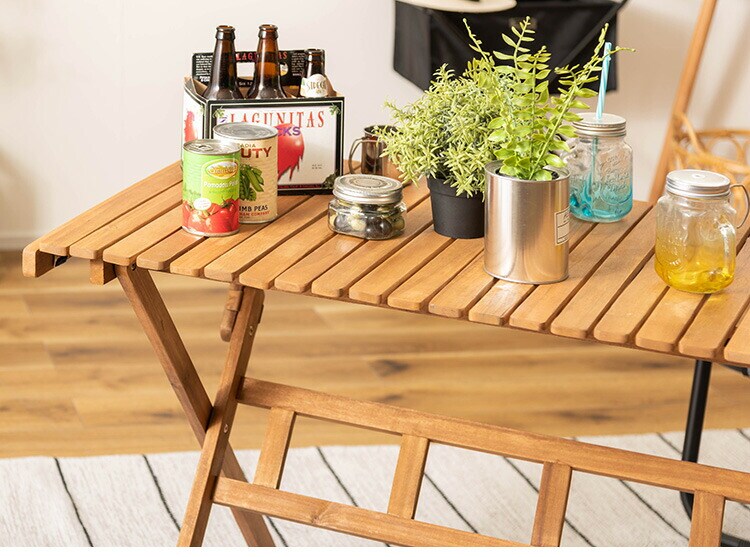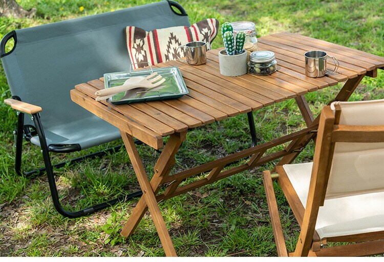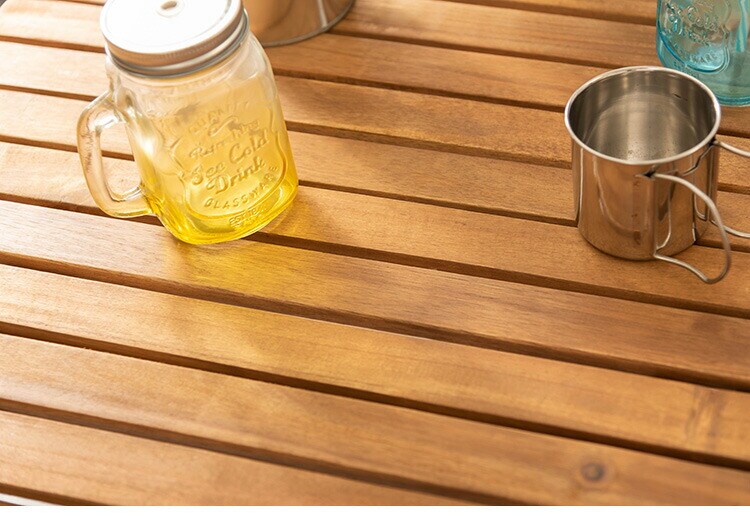 アウトドアやテラスなど様々なシーンで活躍するロールトップテーブル。工具不要で分解ができるので、持ち運びや収納にも便利です。