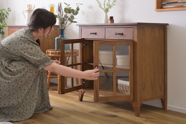 キャビネット ミンディ材 天然木 アンティーク スリム 省スペース 小さめ 黒アイアン ブラウン 収納 扉付き 棚付き 引き出し付き ガラス扉 おしゃれ 模様替え【送料無料】