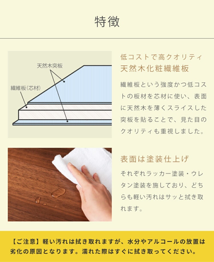 天板はウレタン塗装を施してあるのでお手入れ簡単。