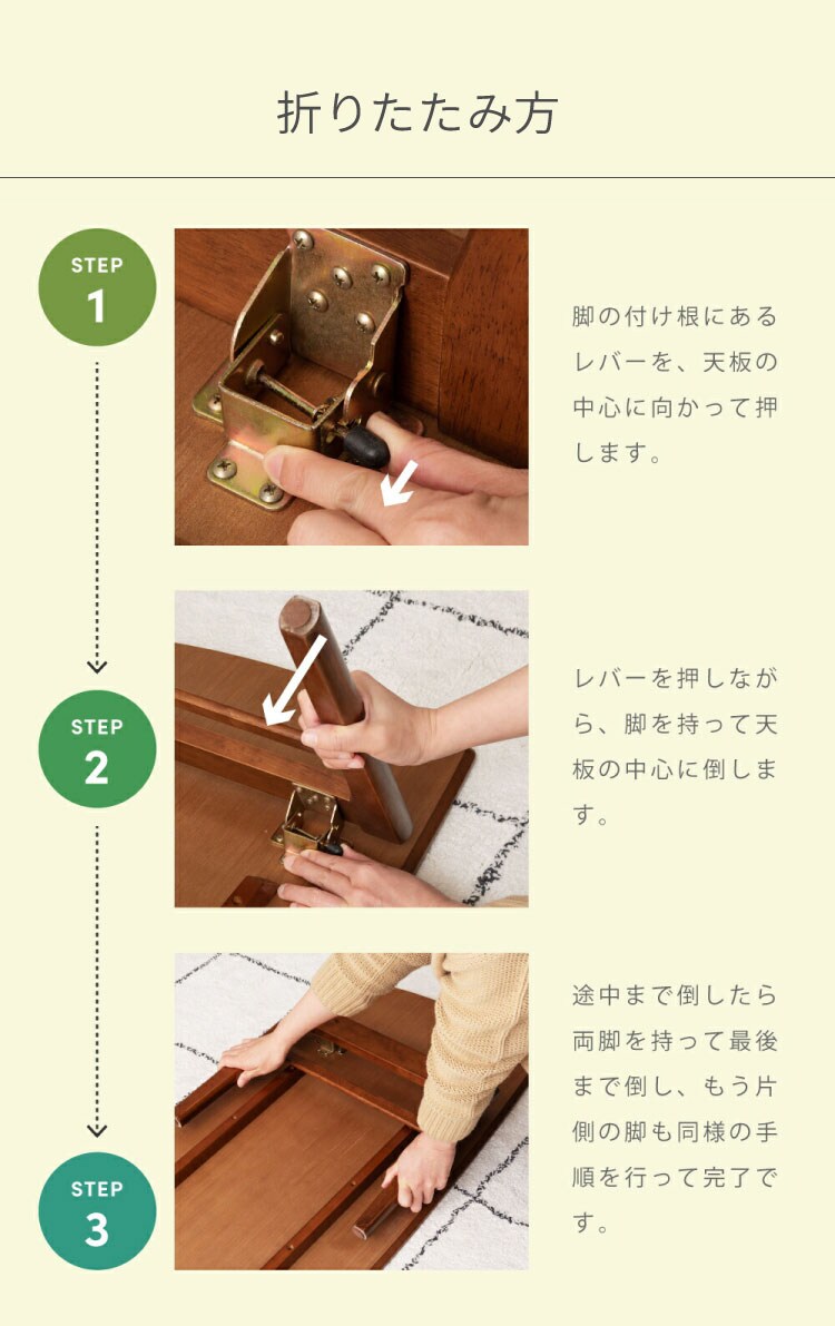 使わない時は脚を折りたためば厚さ約9cmと薄くなるので、ソファの下や隙間に収納する事もできるので便利。