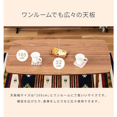 天板サイズは幅105cm×奥行52cmのゆとりのあるサイズ。床に座りながらちょっと仕事にも適したサイズ感。