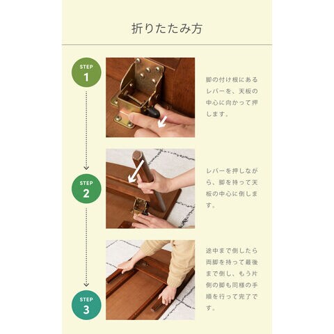 簡単に脚を折りたたむ事ができるフォールディングタイプ。脚の内側に付いているレバーを操作するだけの簡単仕様。