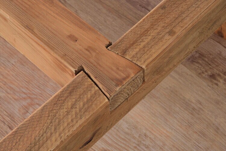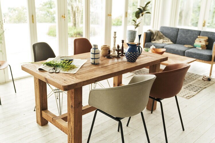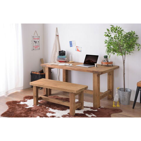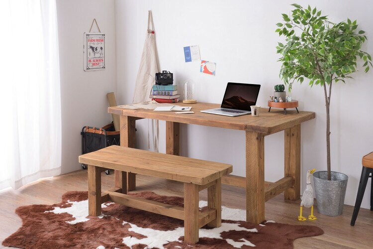 重厚感・重量感のある風合いが魅力的なテーブルとベンチ。