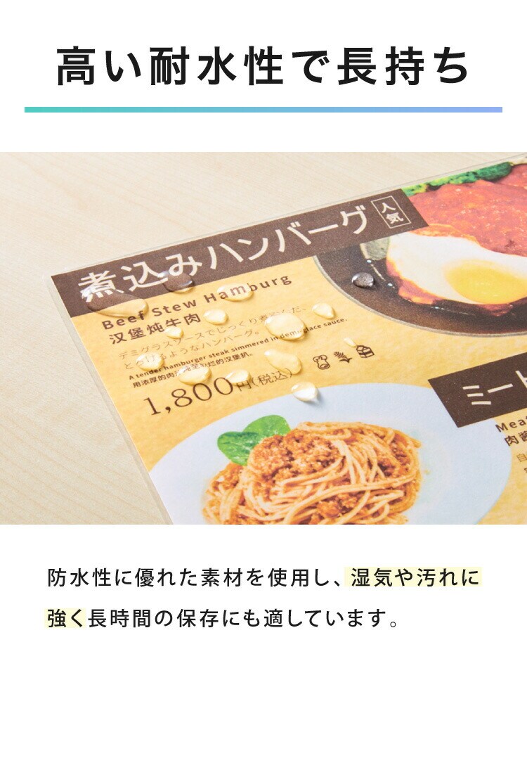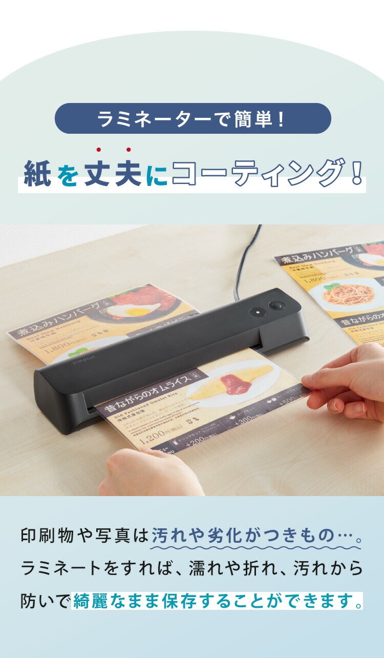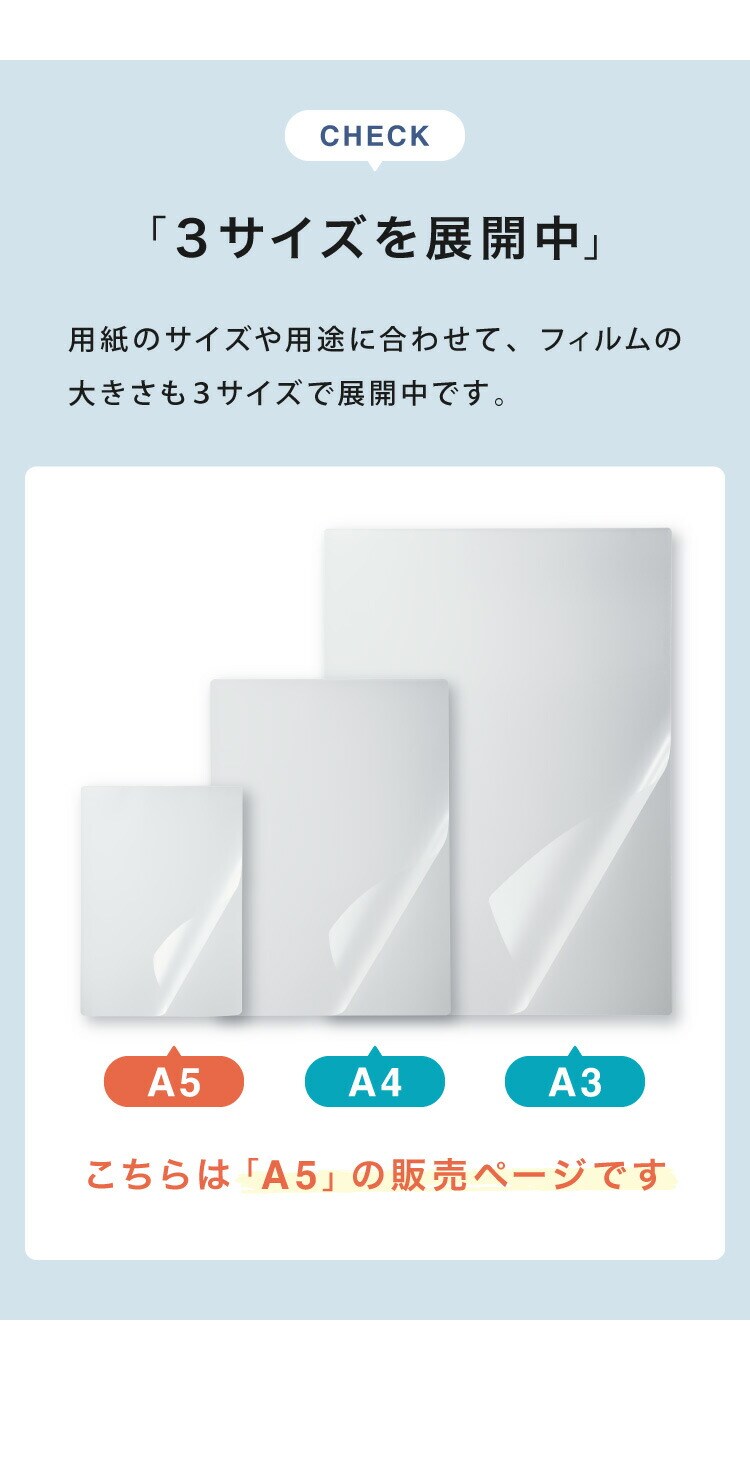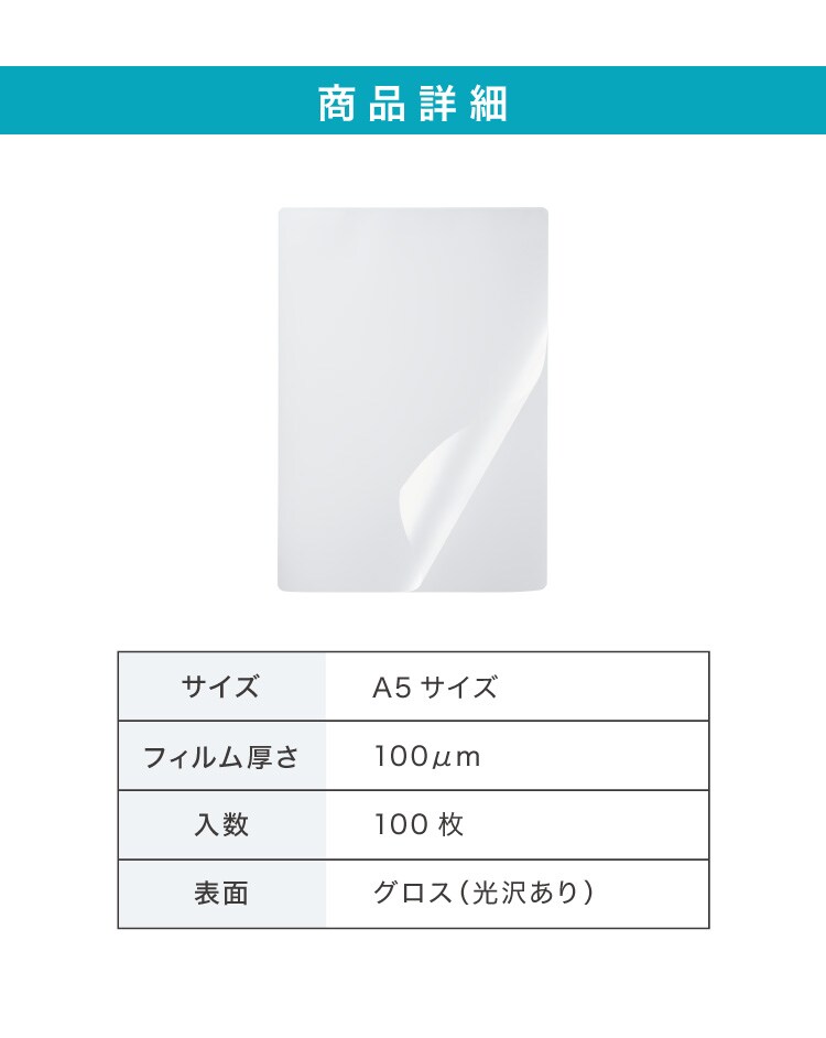 ラミネーター専用フィルム、印刷物保護、パンフレット、資料、名刺、はがき、メニュー、写真、透明度高、グロス、耐水性、3層構造、長持ち、反りを防ぐ、A3、A4、A5、100枚、剥がれにく、気泡なし、糊もれ防ぎ、汚れ防止、ラミネート加工、事務用品、高品質、100μm、光沢あり、光沢仕上、高耐久、業務用、家庭用、オフィス用、はがき、名刺、写真、年賀状、アイドルカード、賞状、書類、ラミネートフィルム、お徳用、100枚入、100マイクロメートル、ラミネーター