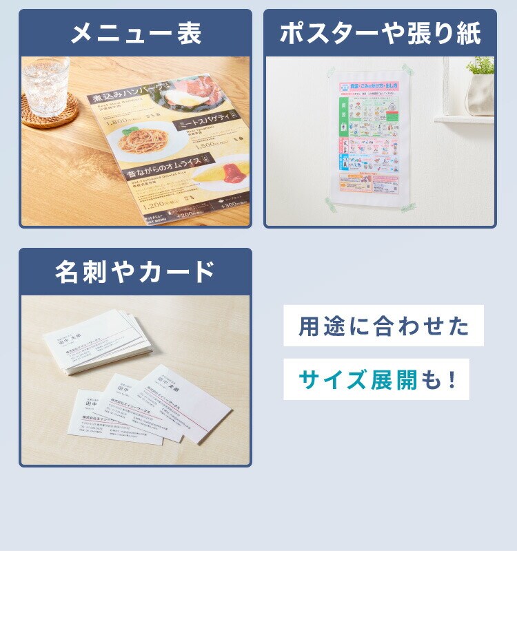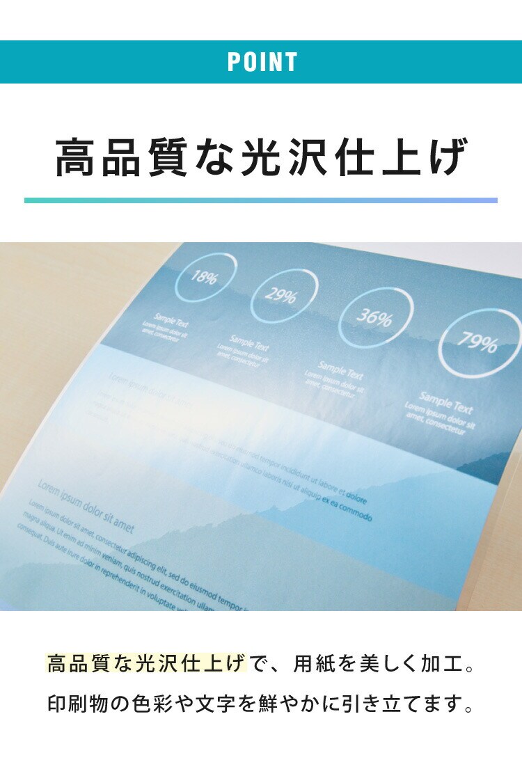 高品質な光沢仕上げで、仕上がりが美しく、印刷物の色彩や文字を鮮やかに引き立てます。
