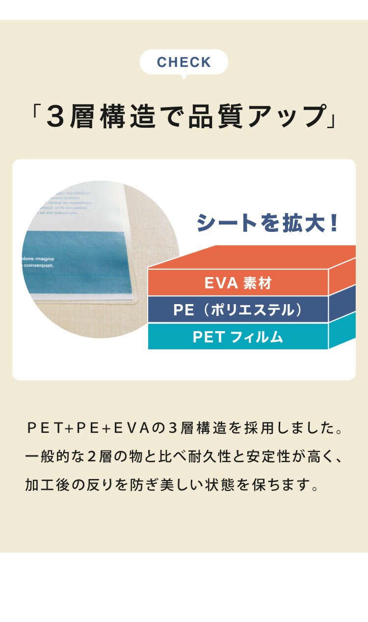 PET+PE+EVAの3層構造を採用し、耐久性と安定性を確保。ラミネート後の反りを防ぎ、長期間美しい状態を保ちます。