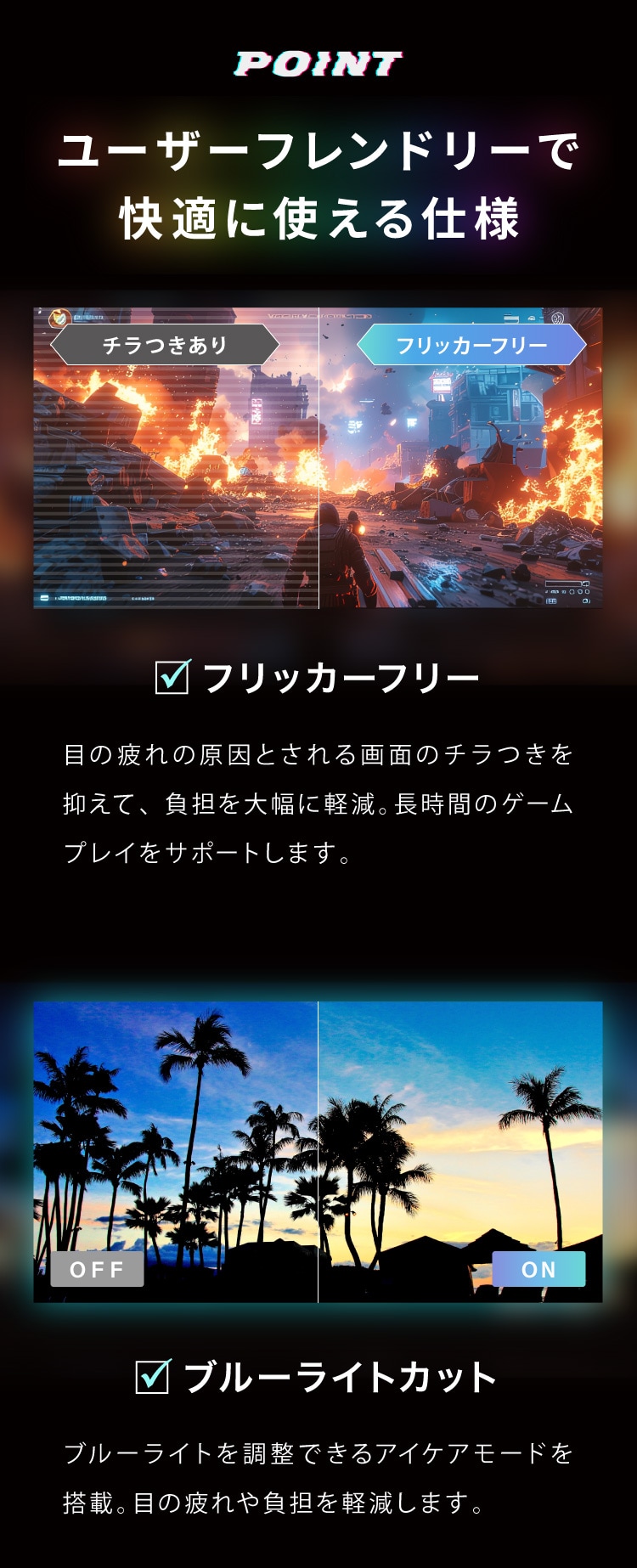 フリッカーフリー&ブルーライト軽減