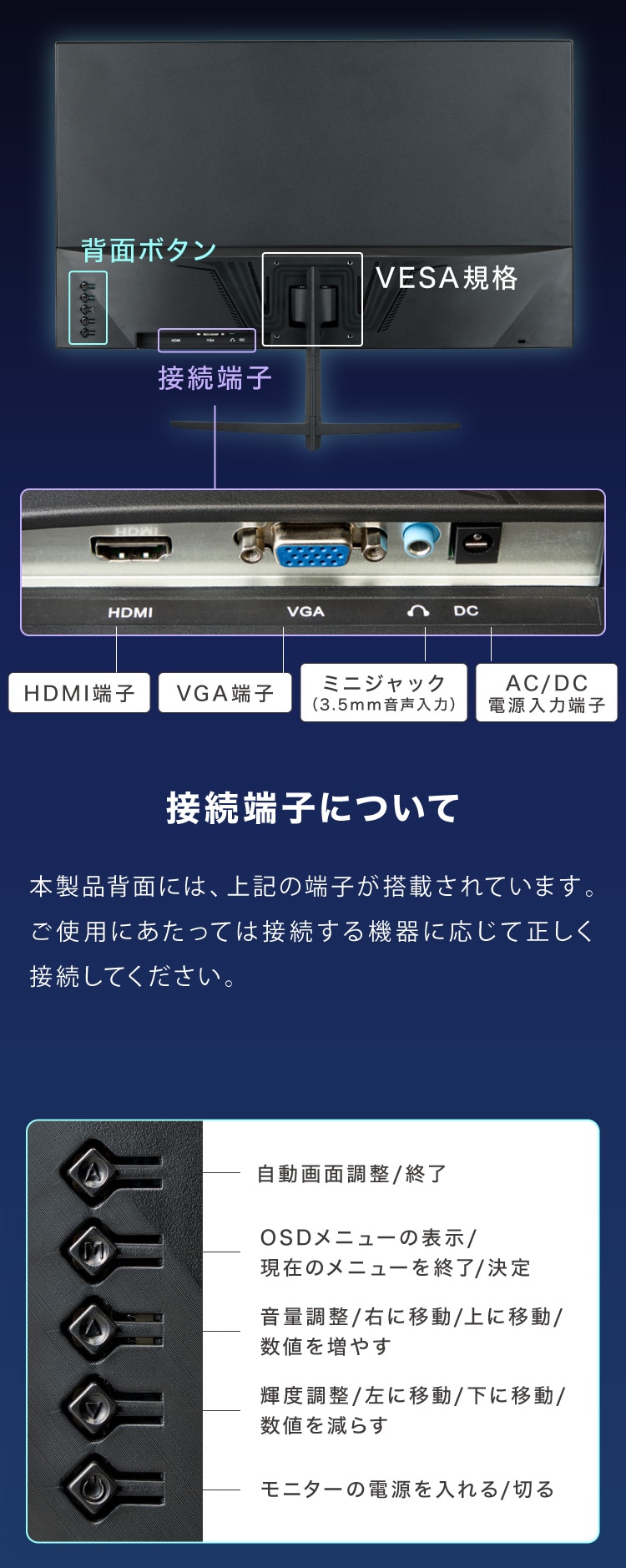 幅広い接続性HDMI・VGA・3.5mm音声出力対応