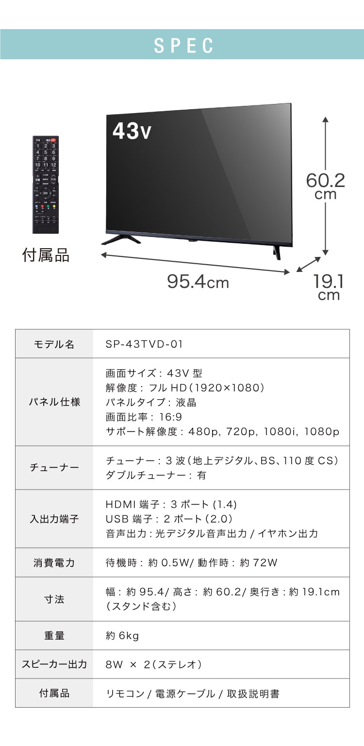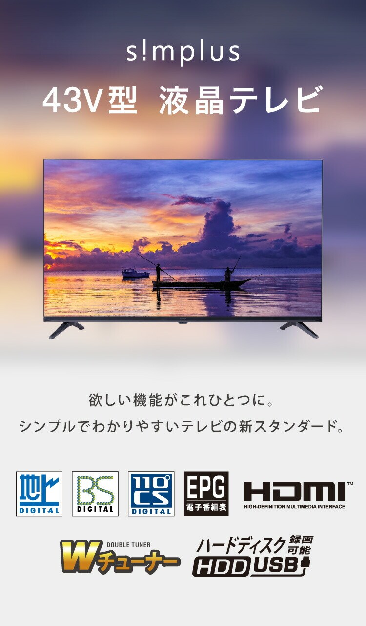 simplus 43型 テレビ ダブルチューナー ベゼルレス フルハイビジョン 液晶テレビ SP-43TVD-01 シンプラス 日本メーカー製LSI搭載 裏番組 VAパネル 地上 BS 110度CSデジタル 外付けHDD録画機能【送料無料】