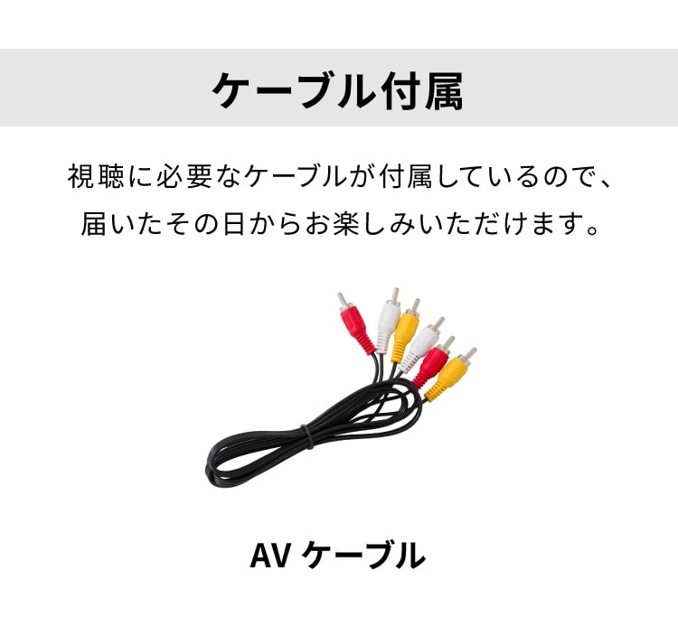 付属品:リモコン、AVケーブル、取扱説明書、保証書、単4形乾電池×2(リモコン動作確認用)