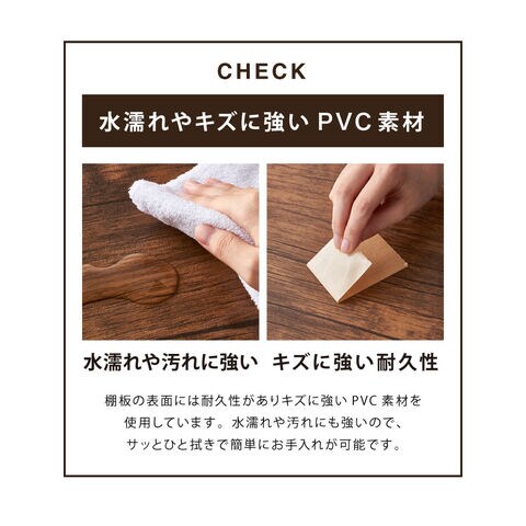 天板表面はPVC素材を使用しております。立体的でリアルな木目を再現し、水濡れやキズに強くなっています。