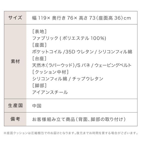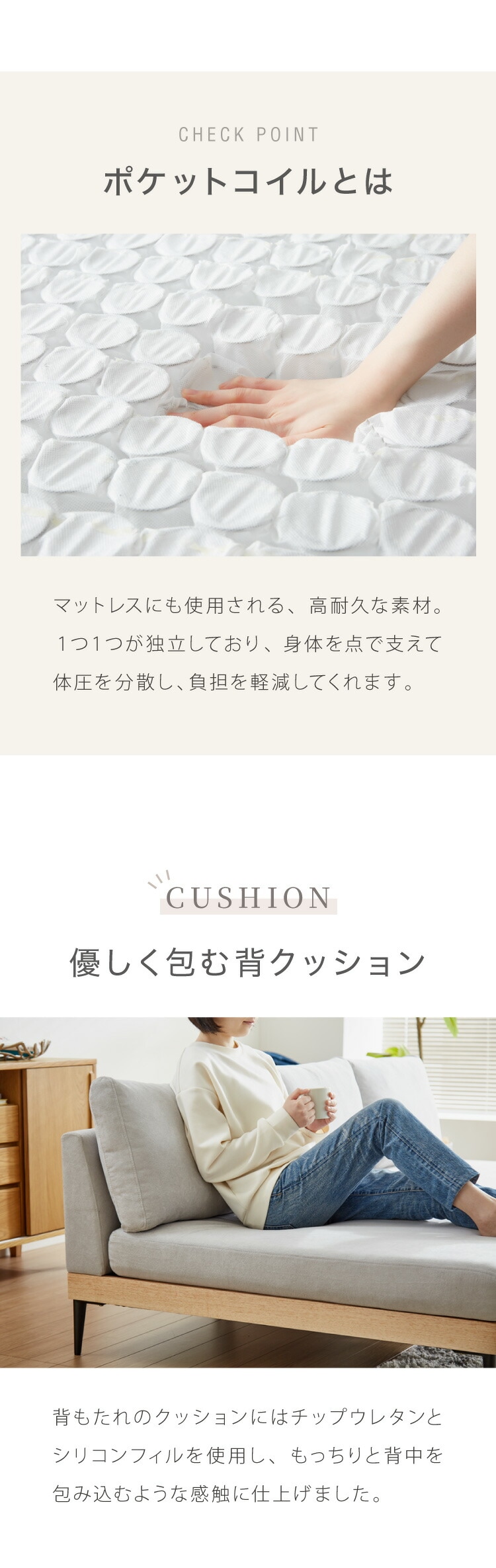 座面:ポケットコイル/35Dウレタン/シリコンフィル綿