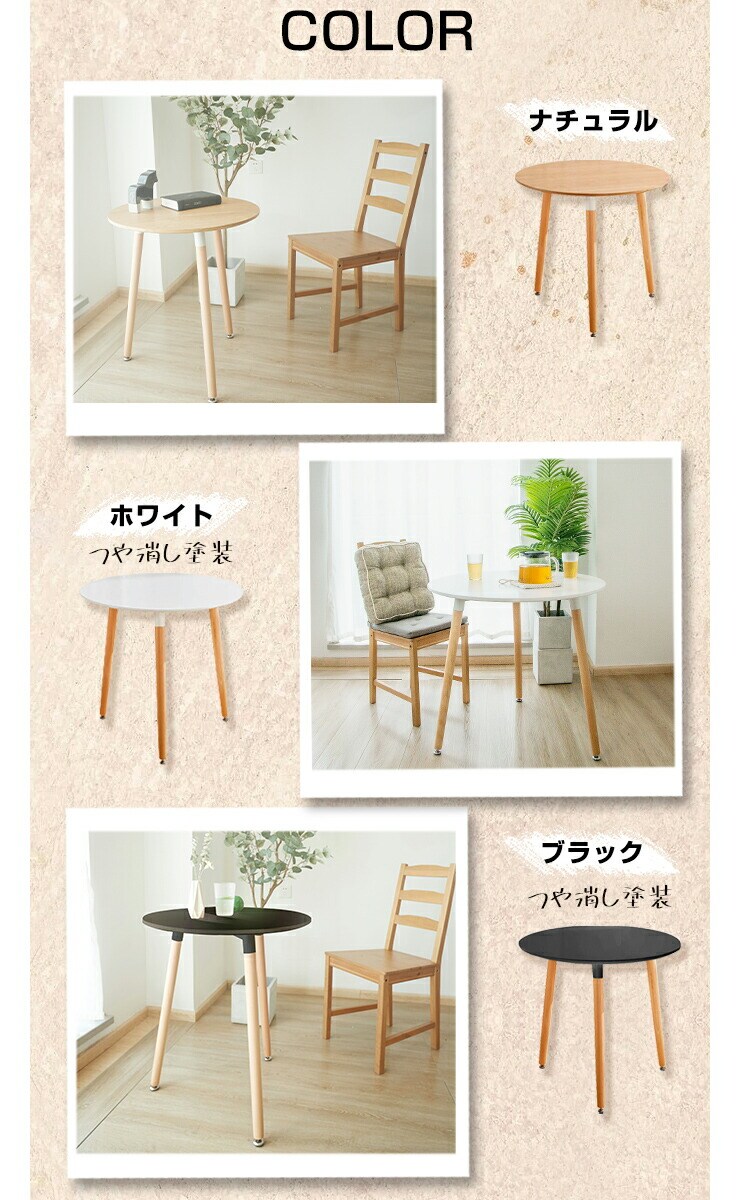 カフェテーブル、丸、幅80cm、高さ70cm、一人暮らし、天然木使用、ナチュラル、ホワイト、ブラック、白、黒、丸脚、耐荷重100kg、円形、カフェ風、おしゃれ、北欧、食卓、コーヒーテーブル、ダイニングテーブル、ラウンドテーブル