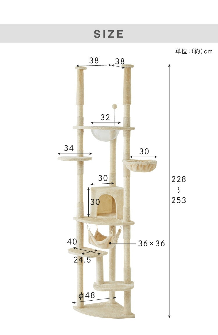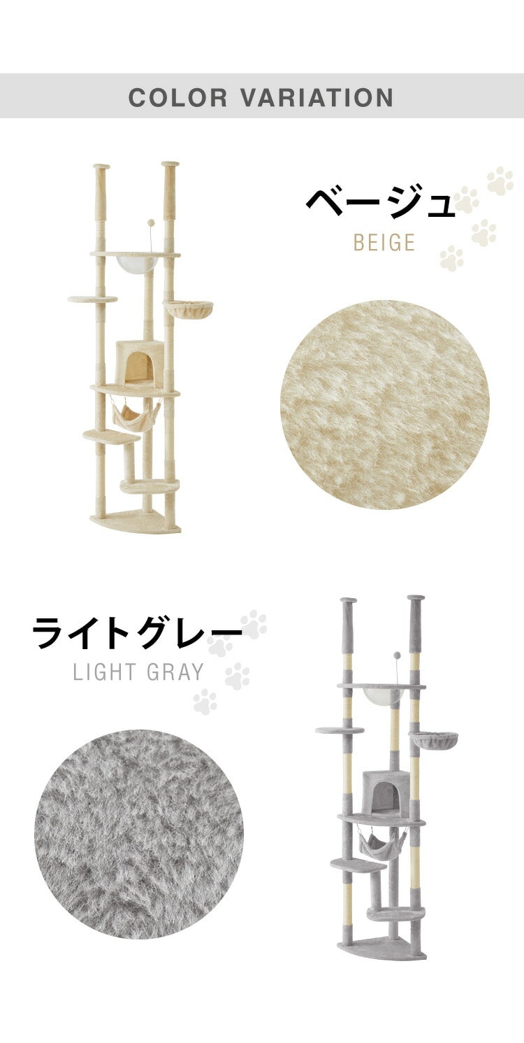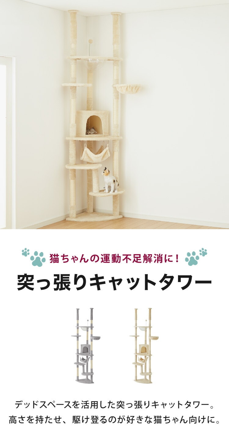 キャットタワー つっぱり 突っ張り 高さ228~253cm ハンモック付 宇宙船付き 隠れ家 ハウス 爪とぎ 大型 ハイタイプ ベージュ ライトグレー キャットハウス 猫タワー 運動不足解消 ペット用品 猫 ねこ【送料無料】